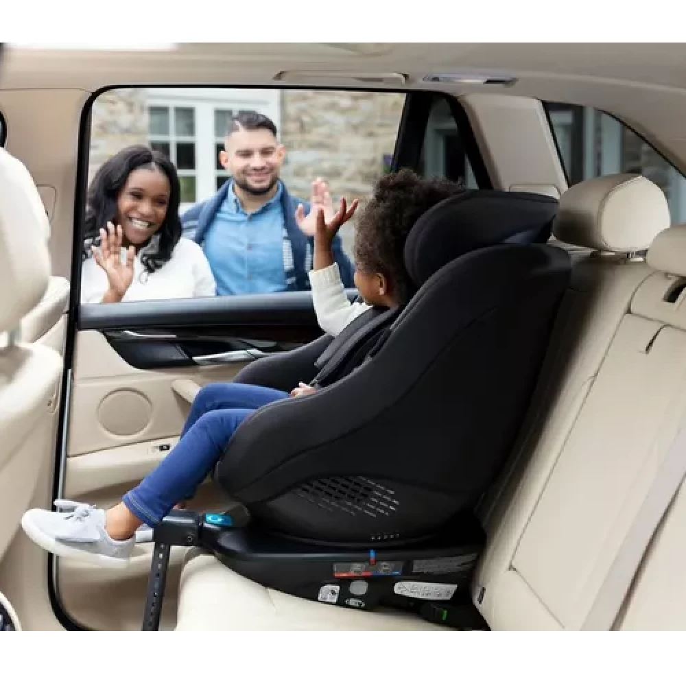 - Transitions from rearward to a forward facing car seat with one easy turn
