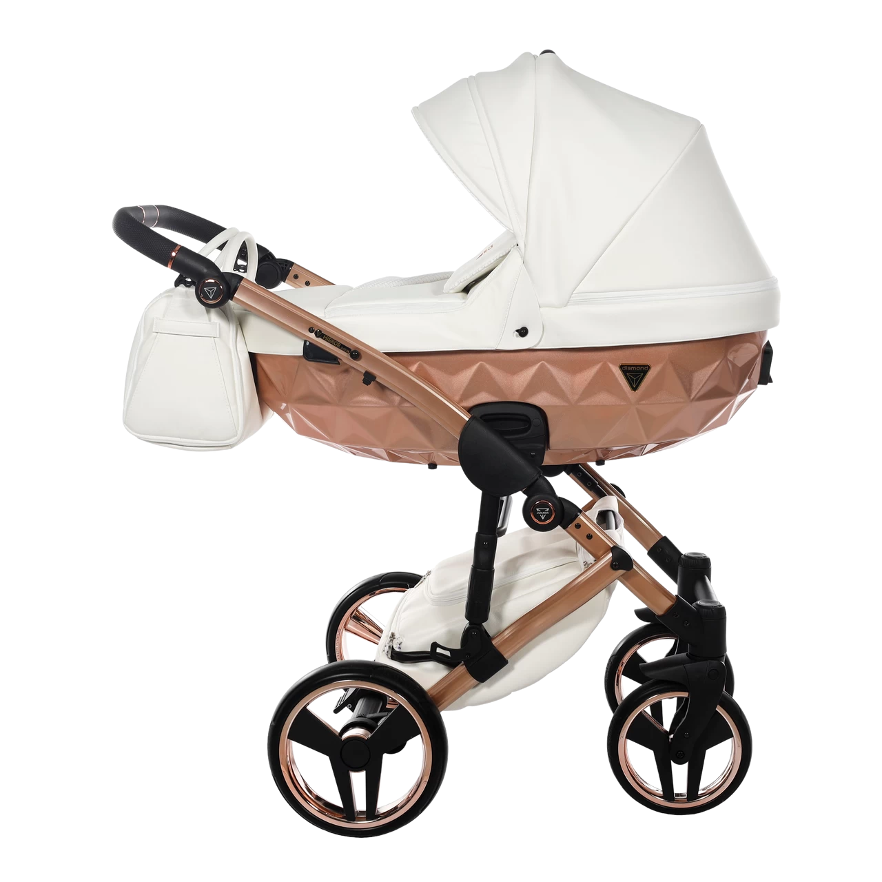 Junama Fluo Individual Pram – Satin White Rose Gold has designed and manufactured exclusive prams in Europe for over 30 years. The Junama pram offers a completely new look in the world of prams. Inspired by the jewel that evokes the greatest emotion, the diamond, Junama designed the rare and beautiful diamond carrycot.