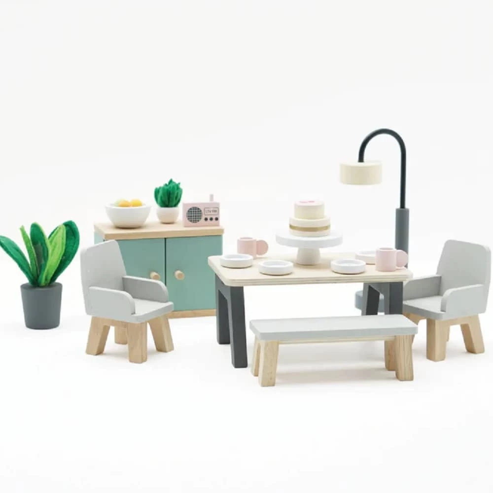 Feast your eyes on this stunning Le Toy Van Doll House Dining Room. The perfect addition to add a touch of modern elegance to any home of miniature. Stylish and sustainable, this 18 piece set is made from FSC® – certified wood.