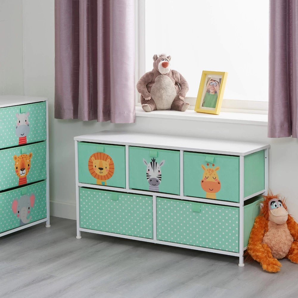 Our unique and exclusive Liberty House Toys Jungle 5 Drawer Kids Storage Chest features cute and engaging animal characters – lion, zebra, and giraffe.