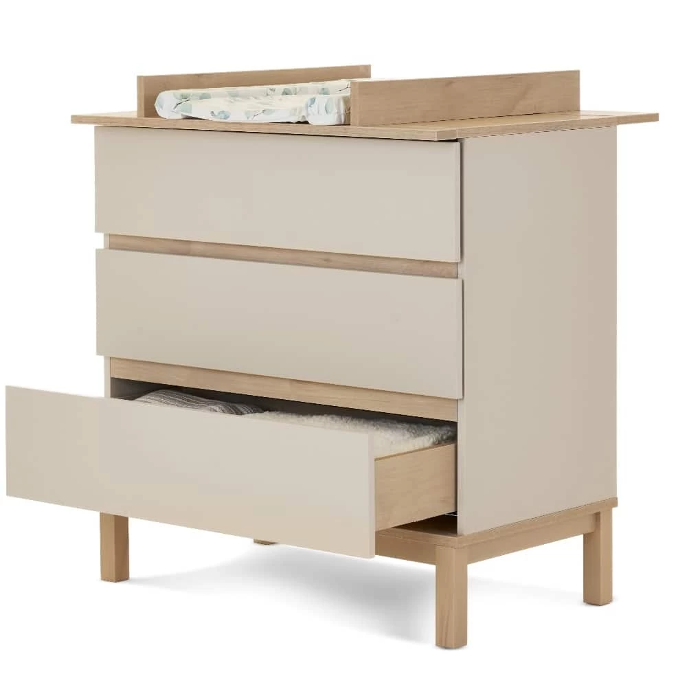 With its clean lines and two-tone colourway, the Astrid is not just a changing unit. The three large drawers fronted by a chic no-handle design provide plenty of storage. While the clever positioning of the changing top means you are stood face on to baby, allowing plenty of precious one to one time. Once you no longer need to use the changer, the removeable top ensures you have a stylish chest of drawers that will complement any room of the house for years to come.
