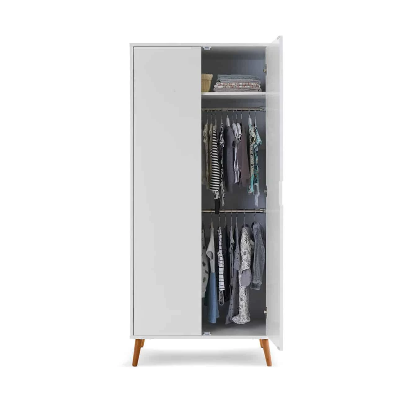 Completing the room set is the Maya double wardrobe. Putting style and functionality at the forefront, it offers the ideal storage solution for your little one’s clothes. The large cupboard space features two hanging rails and a single full width shelf, all fronted by double soft-close doors with recessed handles. Putting your baby’s adorable outfits away has never been easier.