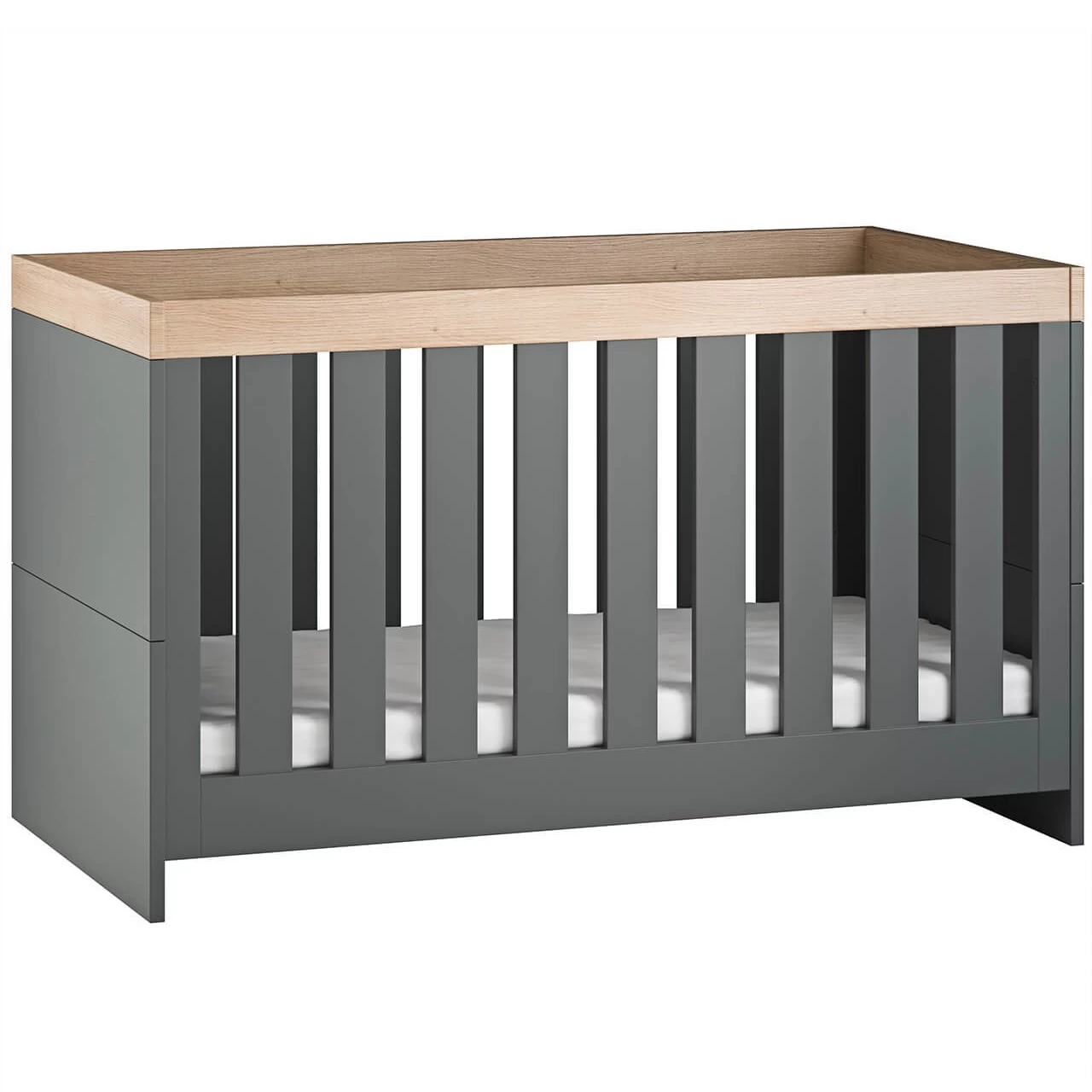 The Stunning Sennen 3 Piece Room Set features stylish and modern Scandinavian-inspired designs with attractive oak syling. This cotbed is sturdy construction and fits into any modern or traditional nursery, it comes complete with two-tone solid ends and chunky wide-slatted sides.