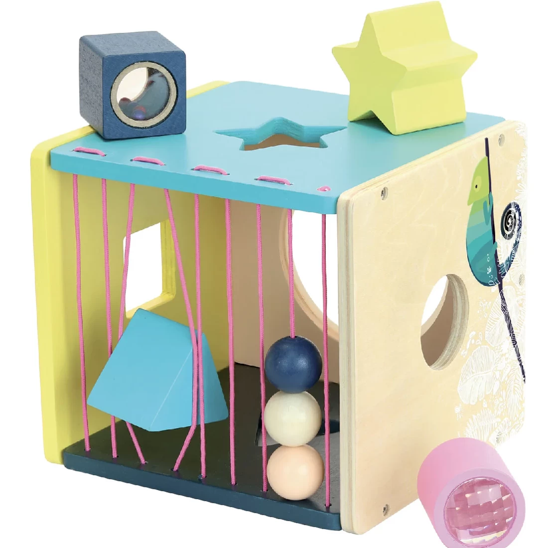 This fun, colourful wooden Vilac Under The Canopy Early Sorting Box will encourage hours stimulating entertainment for your little one. Each side has a different design with which to interact differently, either a mini drum to play, a gap for a block to fit into, or a elastic strings to play with. The blocks are entertainment in themselves, with a cylinder kaleidoscope and a maraca star and cube. The combination of the box with the blocks results in a suburb way to entertain little ones while encouraging curiosity and motor skill development.
